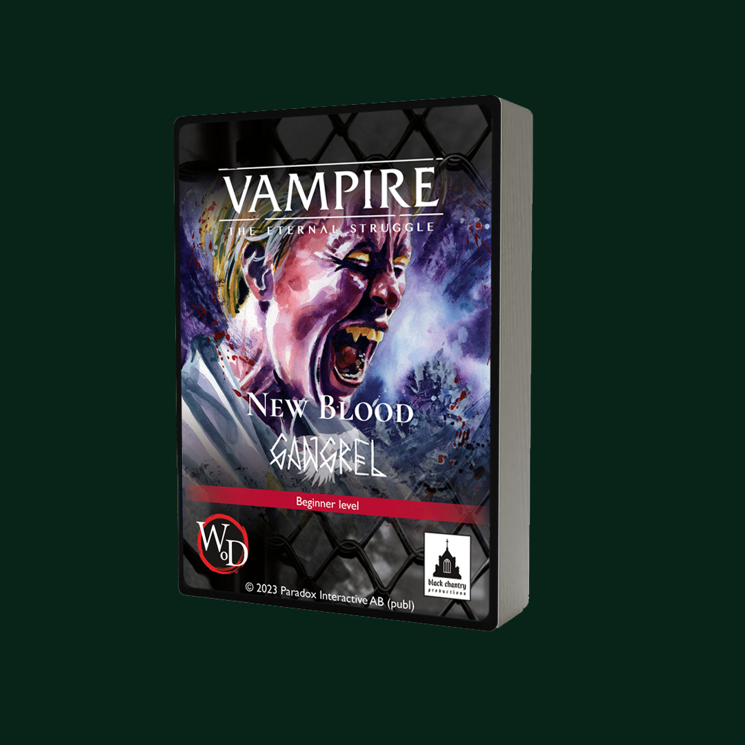 New Blood is a collection of five 55-card preconstructed decks for introductory games of Vampire: The Eternal Struggle. These decks are simpler than tournament level decks, but showcase all the basic mechanics of the game. They are balanced, for a fun and exciting first try of Vampire: The Eternal Struggle. Some of the cards included are reprints and some are new for this set, all ready to mix with cards from other sets.